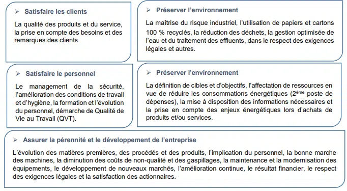 La direction s’engage dans l’amélioration continue de la maitrise des procédés, des comportements et des consommations, en s’appuyant sur la réactivité et la rigueur, par la prévention et le traitement des non-conformités, par le développement de relations de partenariat avec les clients, les fournisseurs, les collectivités locales, les services publics et les associations.